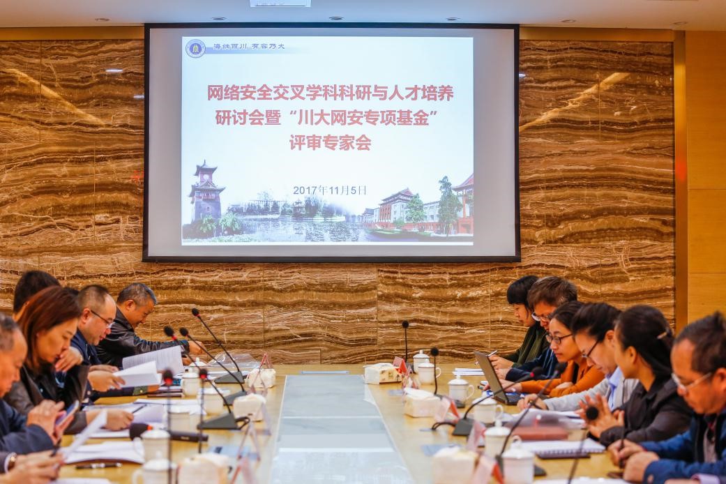 2017年11月5日,网络空间安全学院、网络空间安全研究院在四川大学江安校区国家网络空间安全人才培养基地举行了“网络安全交叉学科科研与人才培养”研讨会暨“四川大学网络安全人才培养专项基金评审”专家会。会议由陈兴蜀常务副院长主持,并介绍了网络空间安全交叉学科平台建设思路。会议特别邀请了沈昌祥院士、中国互联网基金会魏正新秘书长、中国电科第三十所卿昱所长、教育部信息安全教学指导委员会封化民秘书长、中央网信办网安局综合处唐鑫副处长、武汉大学网络空间安全学院赵波副院长、东南大学网络空间安全学院程光常务副院长、电子科技大学网络空间安全研究中心张小松主任、颐信科技黄劲总经理、永信至诚潘柱廷首席信息安全官等学术、政府、企业的知名领导和专家,我校来自教育基金会、网络空间安全学院、网络空间安全研究院、文学与新闻学院、国际关系学院、中国西部边疆安全与发展协同创新中心、等单位的10多名专家、老师参加研讨会。