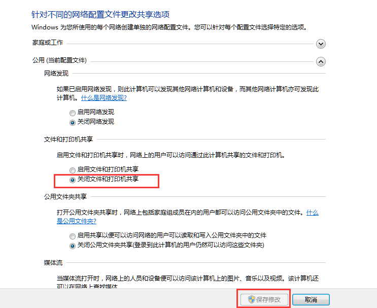 (4)选择“关闭文件和打印机共享”,点击“保存修改”