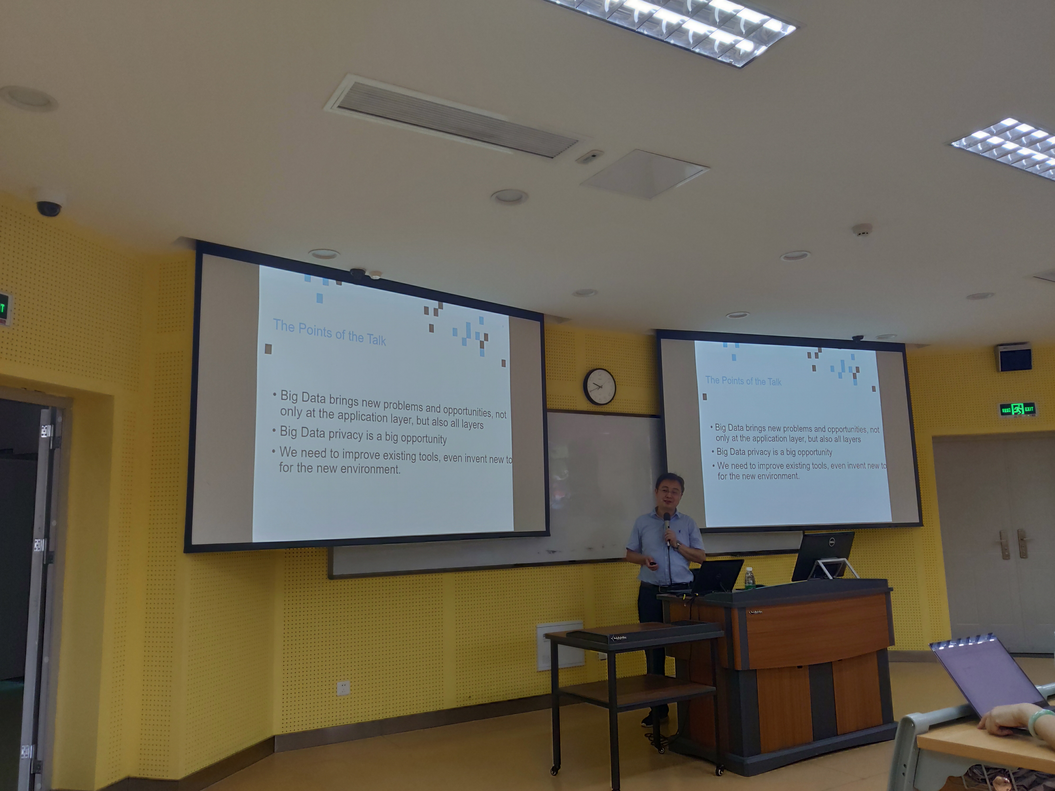 余水教授从大数据技术的基本概念出发,对大数据技术的发展带来的机遇和问题进行了介绍和讨论。余水教授针对大数据带来的隐私问题进行了深层次的探讨,指出了目前面向大数据的隐私研究中存在以下四个关键问题:1)目前缺乏对隐私进行直接测量的方法,这方面的研究可能需要基于跨学科研究人员的共同努力;2)目前对这方面的研究缺乏数学工具,图论等技术还无法有效表达大数据集的高维属性特征;3)目前的研究工作没有对分析数据的来源给予相应程度的重视;4)目前的研究忽略了对数据可用性的研究。余教授在此基础上对问题进行了刨析,同时给出了问题的可能解决方向;最后余水教授对AI研究中的隐私研究进行了梳理和讲解,和同学们进行了愉快的学术交流讨论,并对同学们提出的问题进行了细致解答。余教授还热情邀请同学们前往悉尼科技大学进行学术交流。