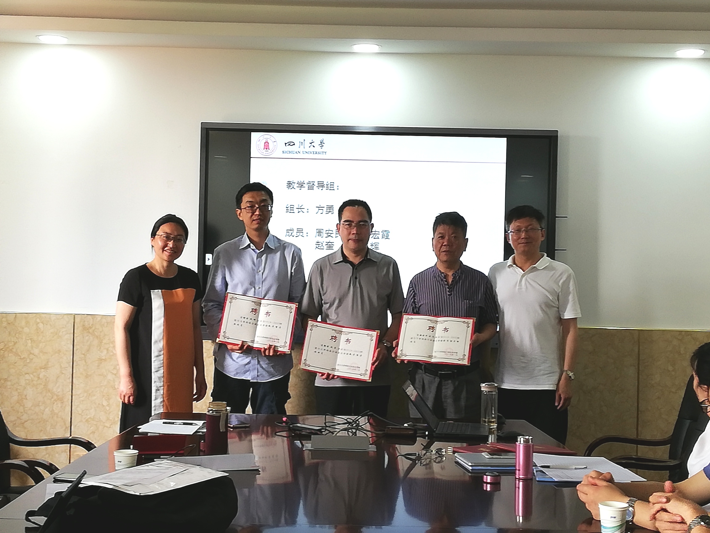 杨院长宣布了我院本科教学督导组成立,介绍了院督导组的工作职责,并与副院长兼直属党支部书记秦燕老师一起向5位督导组成员颁发了聘书。