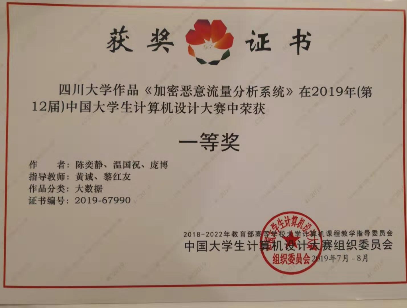 整个参赛过程中得到了学院领导们的高度重视与支持,由陈奕静、温国祝、庞博同学组成的我院参赛队伍,在黄诚老师、黎红友老师的悉心指导下队员们开拓创新,刻苦实践,完成的作品“加密恶意流量分析系统”,经过了四川省级赛的展示答辩,顺利晋级国赛,并在国赛中得到了评委老师的高度认可。