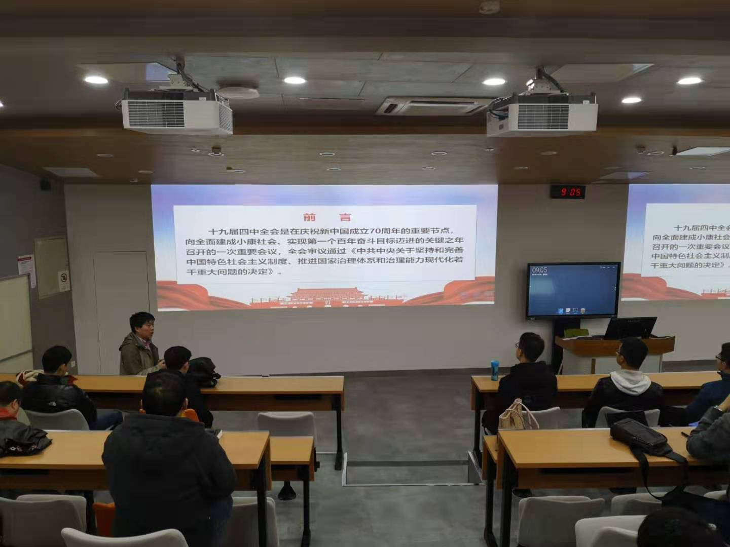会上,黎老师带领大家集中学习了《中国共产党第十九届中央委员会第四次全体会议公报》,并系统介绍了十九届四中全会公报的重点内容,阐述了坚持和完善中国特色社会主义制度,推进国家治理体系和治理能力现代化的重大意义、总体要求及我国国家制度和国家治理体系十三方面的显著优势。