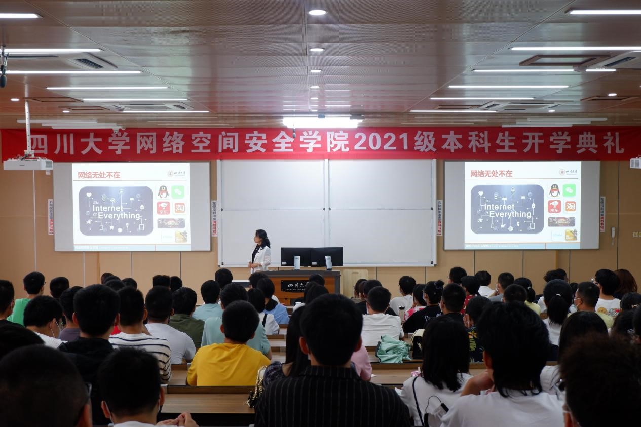 学院常务副院长陈兴蜀教授从国际网络安全目前的形势、国家对于网络安全的高度重视等方面展开介绍,体现了网络安全的不可或缺。她接着向大家介绍了学院的发展历史、今年首届毕业生取得的成绩,展现了我院深厚的教学实力,鼓励大家努力学习,共建我院辉煌。