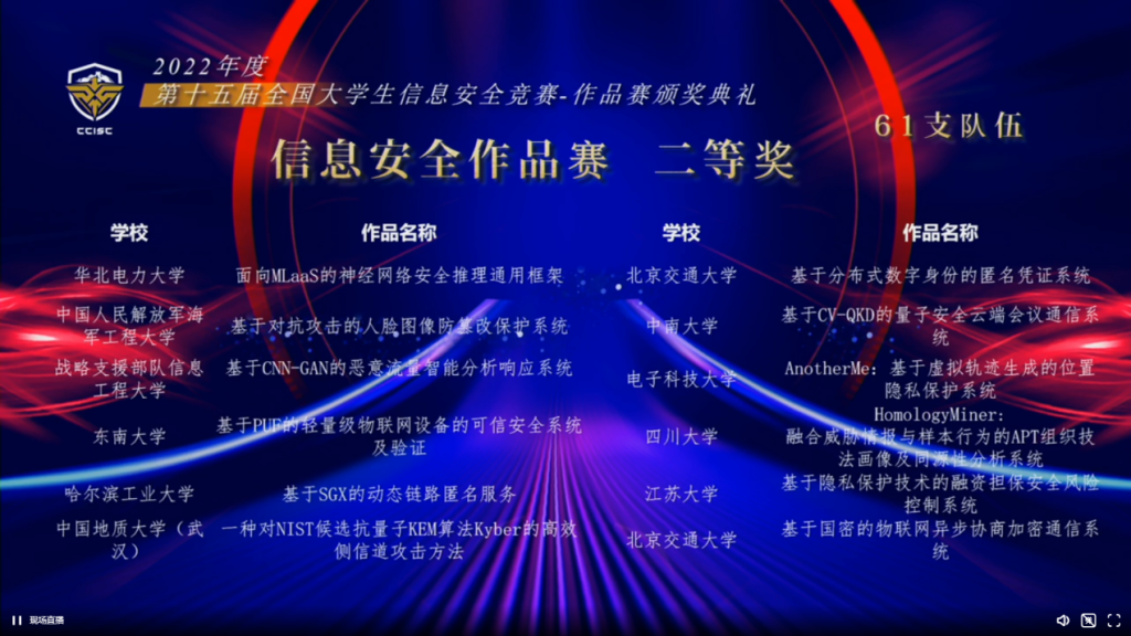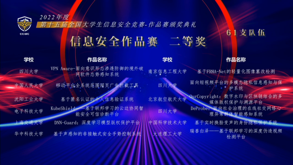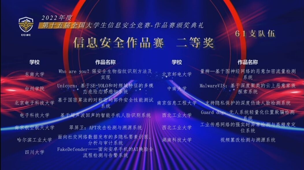 全国大学生信息安全竞赛由教育部高等学校网络空间安全专业教学指导委员会主办,是我国网络空间安全学科领域的奥林匹克竞赛。据悉,全国大学生信息安全竞赛已正式入选全国普通高校学科竞赛排行榜,为目前网络空间安全学科领域唯一一个入选排行榜的赛事。本届作品赛由湖南大学承办,浙江大学协办,总决赛采取线上随机分区评审的形式,共有来自全国191所高校的728支团队、2692名大学生参加,最终评选出最具创业价值奖10项、一等奖40项、二等奖61项、三等奖79项,并从一等奖作品中评选出10个最具创业价值奖参与后续由中国网络安全产业联盟举办的2022网络安全优秀创新成果大赛总决赛。