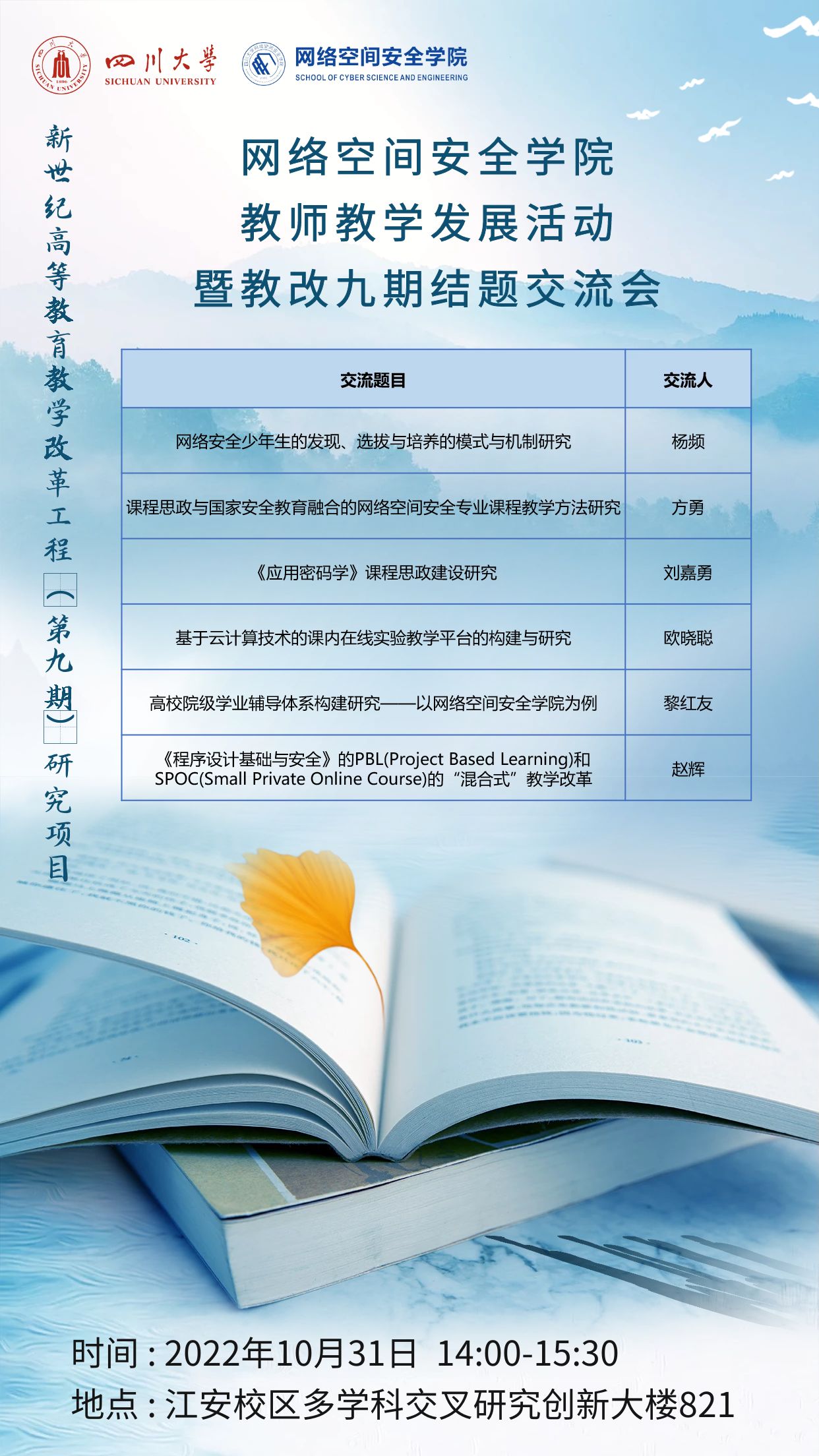 为有效推动本科教学改革,提升学院本科教学质量,我院于2022年10月31日在江安校区多学科交叉研究创新大楼821会议室开展网络空间安全学院教师教学发展活动暨四川大学“新世纪高等教育教学改革工程(第九期)研究项目”结题交流会。学院邀请到了建筑与环境学院副院长兰中仁、学院督导委员会的专家赵奎、王宏霞3位评审专家,学院6个项目负责人进行了结题汇报,会议由学院副院长杨频主持。