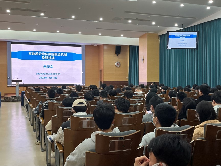 2022年11月17日星期四下午,应四川大学网络空间安全学院邀请,南京航空航天大学计算机科学与技术学院朱友文教授通过线上会议形式为网络空间安全学院师生带来了题为“本地差分隐私数据聚合机制及其挑战”的学术讲座。本次讲座由网络空间安全学院张意副院长主持。
