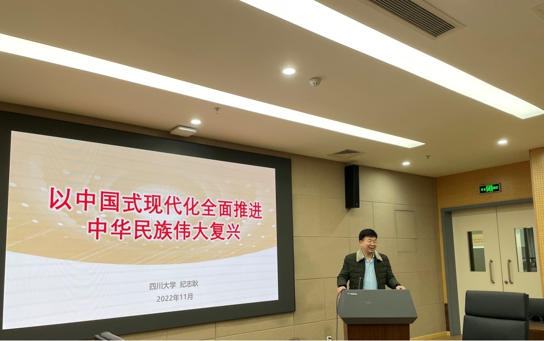 2022年12月2日,我院召开学习贯彻党的二十大精神宣讲会,邀请四川大学学习贯彻党的二十大精神宣讲团成员、马克思主义学院纪志耿教授作宣讲报告,会议由学院党总支书记秦燕主持,全体教职工参加了宣讲会。