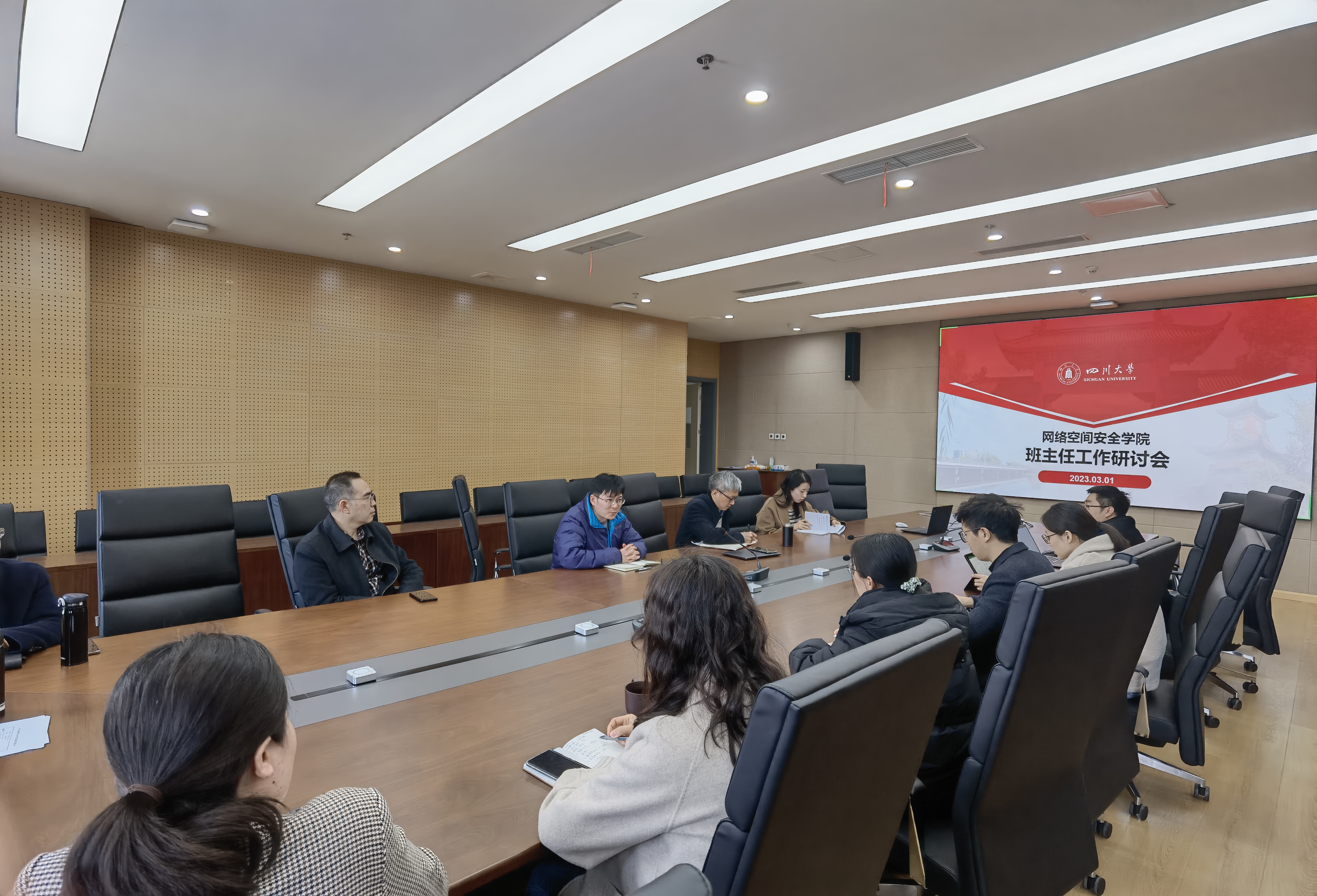 杨院长接下来组织班主任们学习了《四川大学班主任工作指导意见》,强调了班主任队伍建设的重要性和必要性,班主任是学校立德树人、全面培育和践行社会主义核心价值观教育的骨干力量,是发挥专业课教师独特影响力引领大学生健康成才、全面成长的指导者和引路人。班主任应贯彻落实国家和学校的教育方针政策,坚持育人为本、德育为先,在潜移默化、润物细无声的关爱中引导学生健康成长。同时希望班主任们可以参照《指导意见》中的职责及考核办法履职尽责,协同推进提高网安人才培养质量的系统工程。