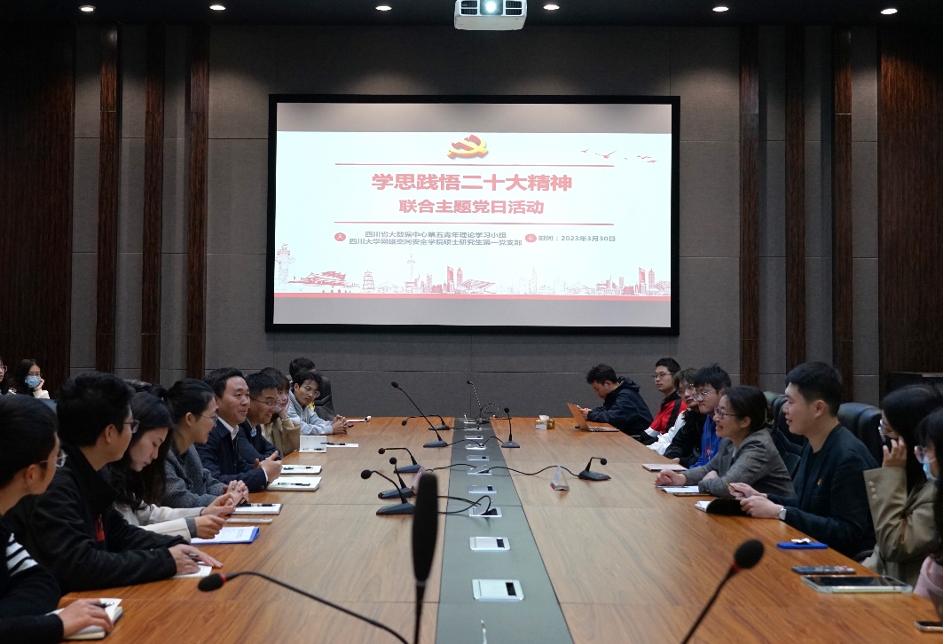 3月30日,我院硕士研究生第一党支部同四川省大数据中心青年理论学习第五小组于江安校区网络空间安全学院网络靶场会议室联合开展了“学思践悟二十大精神”主题党日活动。学院部分领导老师,硕士研究生第一党支部党员,以及省大数据中心党办、网站处、技术服务中心相关青年代表们共计20余人参加活动。