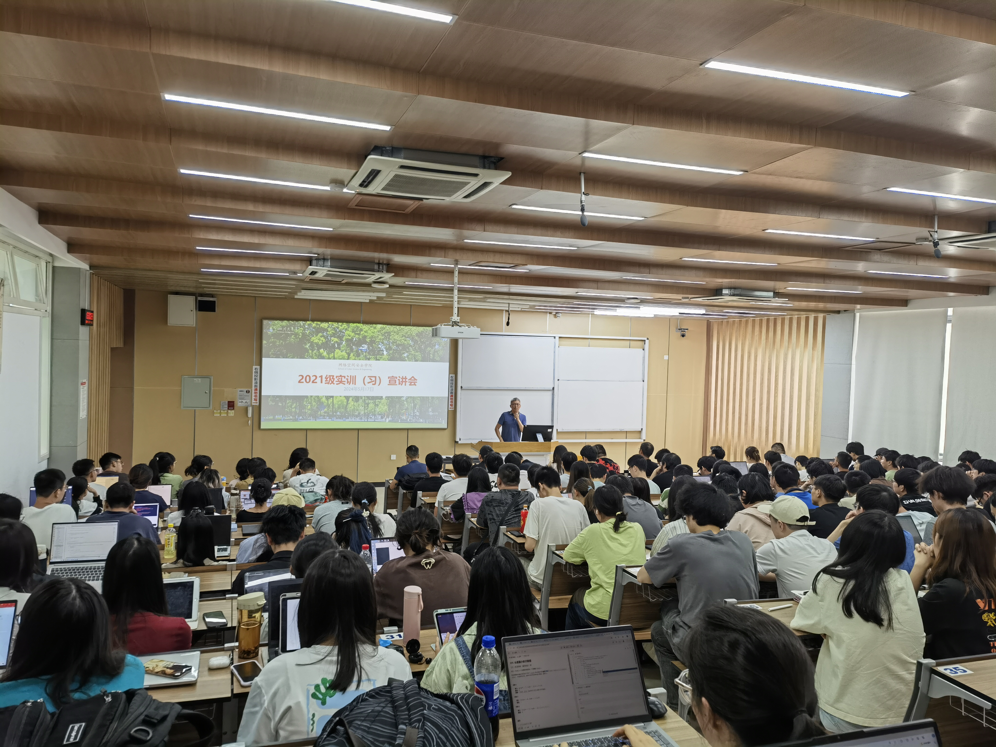 为增强学生实践动手能力,提高毕业生就业竞争力,我院于5月17日在四川大学江安校区综合楼C座403教室举行2021级本科生实习动员宣讲会。我院邀请到了成都国信安信息产业基地有限公司、绿盟科技集团股份有限公司、成都肆零肆网络科技有限公司、四川天融信教育科技有限公司、成都无糖信息技术有限公司、成都知了汇智科技有限公司等六家行业知名企业负责人到场,网络空间安全学院副院长杨频、2021级辅导员老师、本科教学科老师以及2021级全体学生出席了宣讲会,会议由学院副院长杨频主持。
