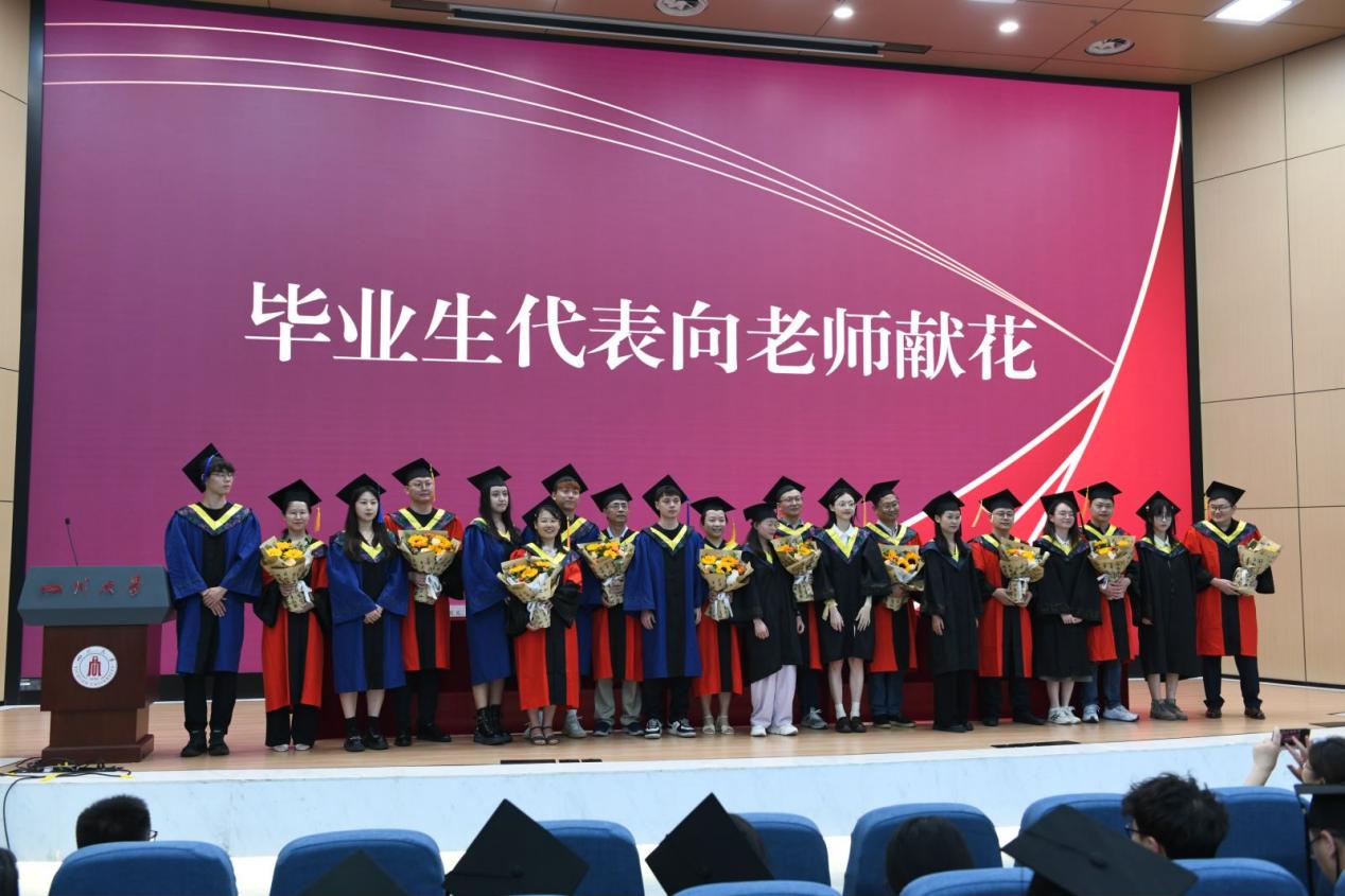 在典礼尾声,毕业生代表向辛勤付出的老师们献上鲜花,表达对他们深深的感激与敬意。最后,举行了“校友联络员”颁奖仪式,希望他们能够延续大家在学院结下的缘分。