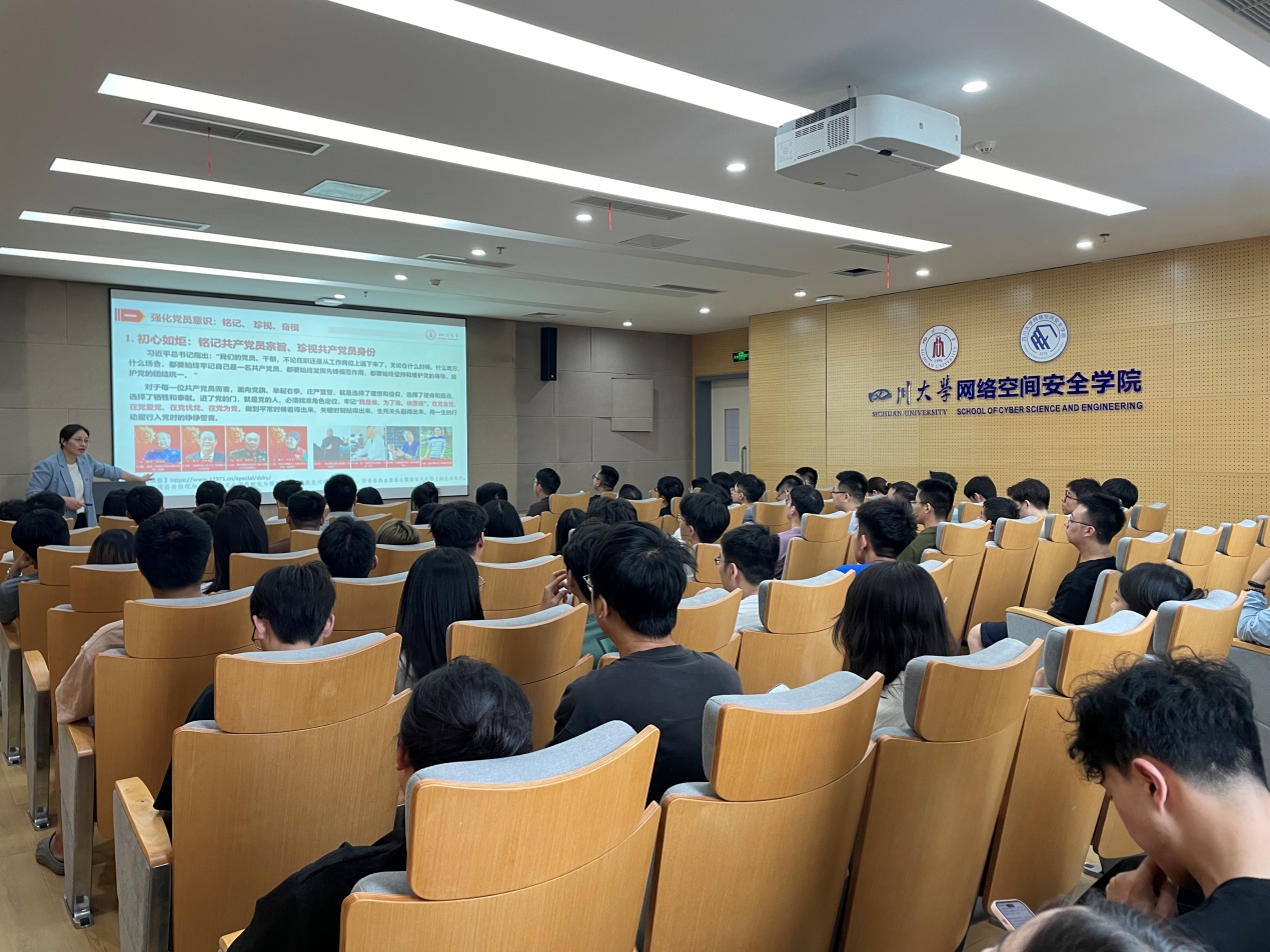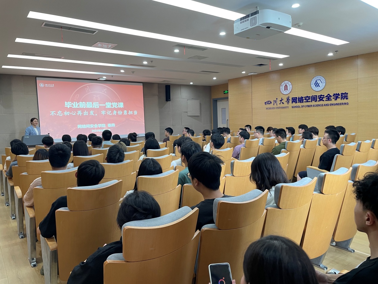 为深入开展学习贯彻习近平新时代中国特色社会主义思想主题教育,强化毕业生党员身份意识,引导毕业生党员坚定理想信念,牢记使命担当, 6月17日下午,四川大学网络空间安全学院在学院919室开展2025届毕业生党员“最后一堂党课”。学院党总支书记秦燕为全体毕业生党员讲授专题党课,此次党课的主题为《不忘初心再出发,牢记身份勇担当》。
