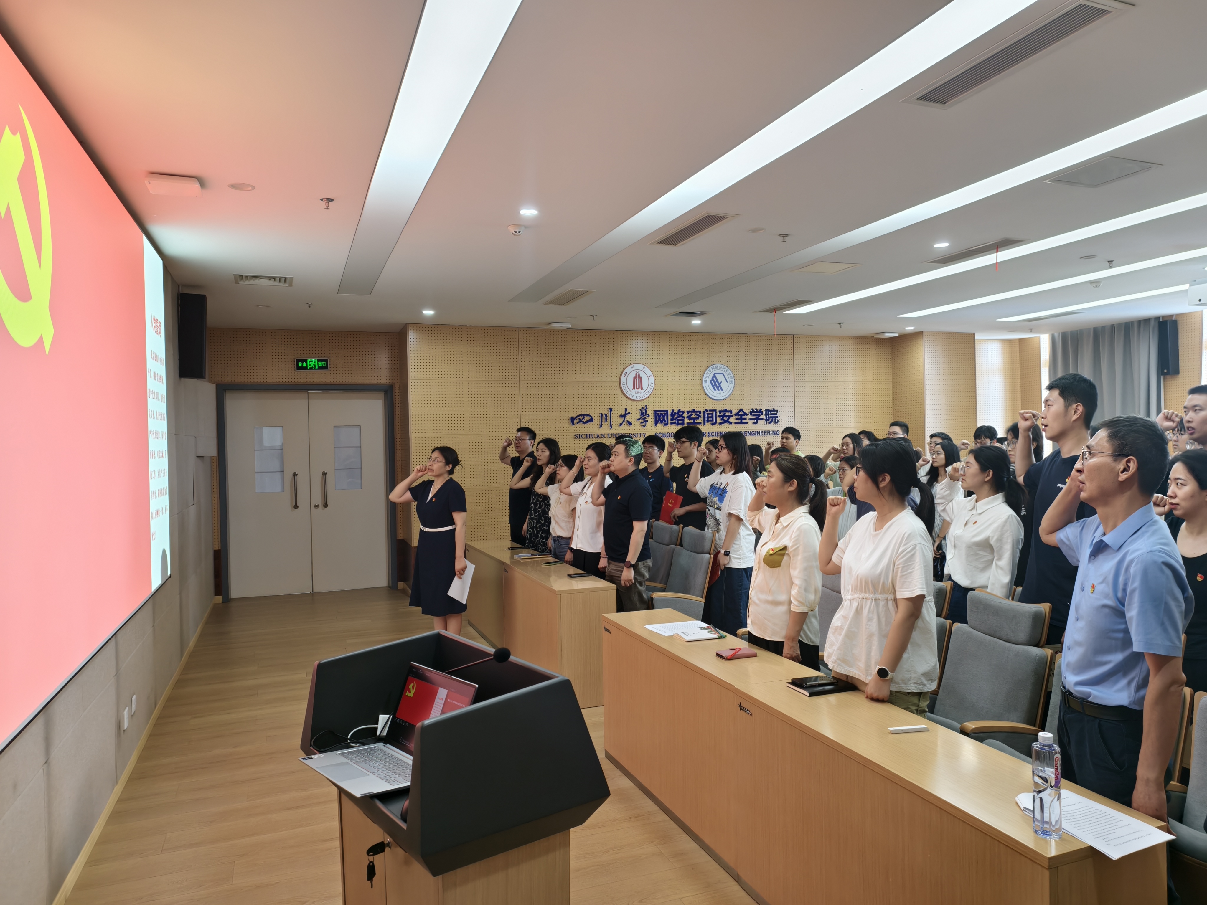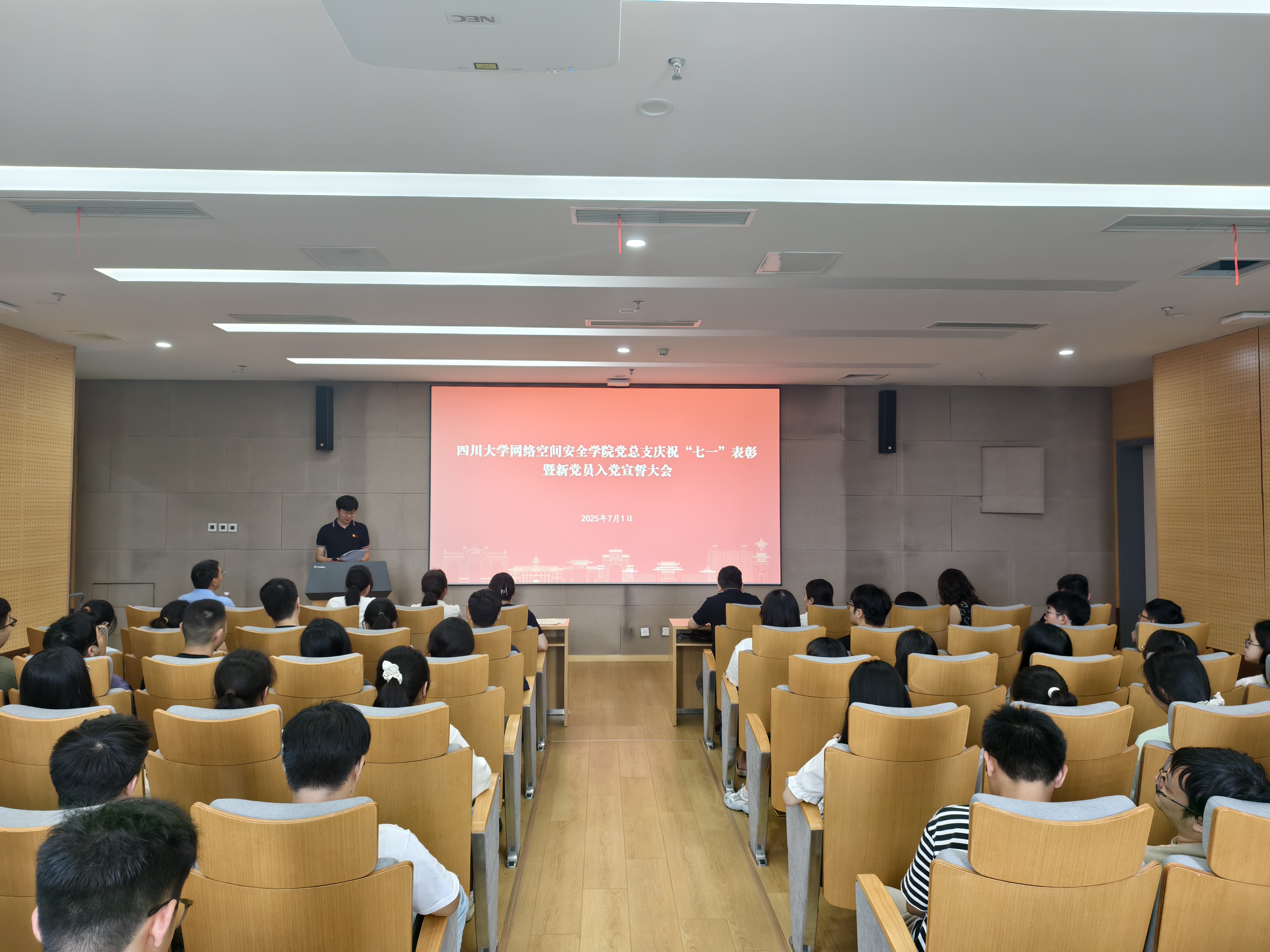 7月1日下午,网络空间安全学院在江安校区多学科交叉研究创新大楼919会议室举行庆祝“七一”表彰暨新党员入党宣誓大会。学院党总书记秦燕、党总支副书记兼副院长张意,党总支全体委员,专职组织员,各党支部书记及支委,全体辅导员,受表彰的先进党支部代表、优秀共产党员和优秀党务工作者、以及2024年下半年和2025年上半年新发展的党员参加大会,张意主持大会。
