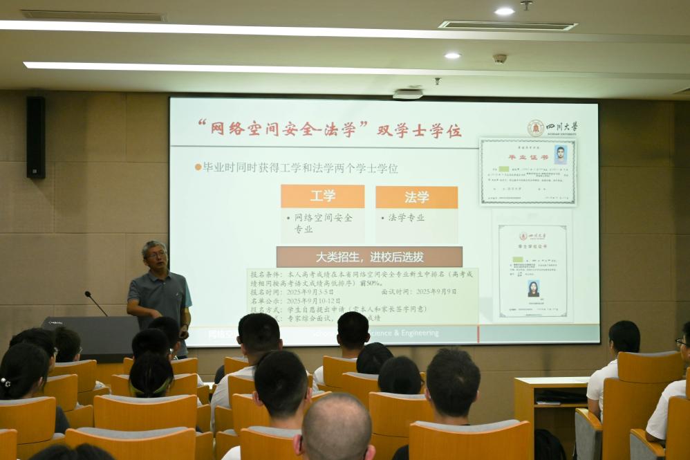 9月3日下午,网络空间安全与法学双学士学位项目宣讲会在江安校区多学科交叉研究创新大楼919会议室举行。学院副院长杨频教授面向2025级新生全面解读了该双学位项目的培养特色与具体政策,并就同学们普遍关心的问题进行了现场交流与解答。