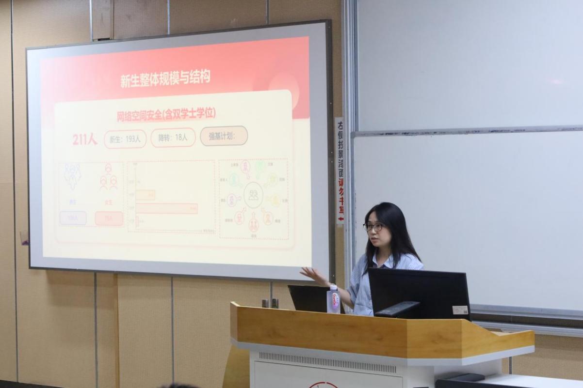 会议伊始,学院副院长杨频教授系统介绍了学院的发展历程,从学科初创到成为网络空间安全领域重要的人才培养与科研基地,展现了学院深厚的办学底蕴与清晰的进阶路径。他还就学院的硬件设施,包括专业实验室与现代化实训平台,作了详细说明,体现出学院对学生实践创新能力培养的高度重视。在人才培养方面,杨频教授重点解读了网络安全与法学双学位项目的课程结构、培养目标与选拔机制,为有意向的学生及家长提供了权威、清晰的指引。