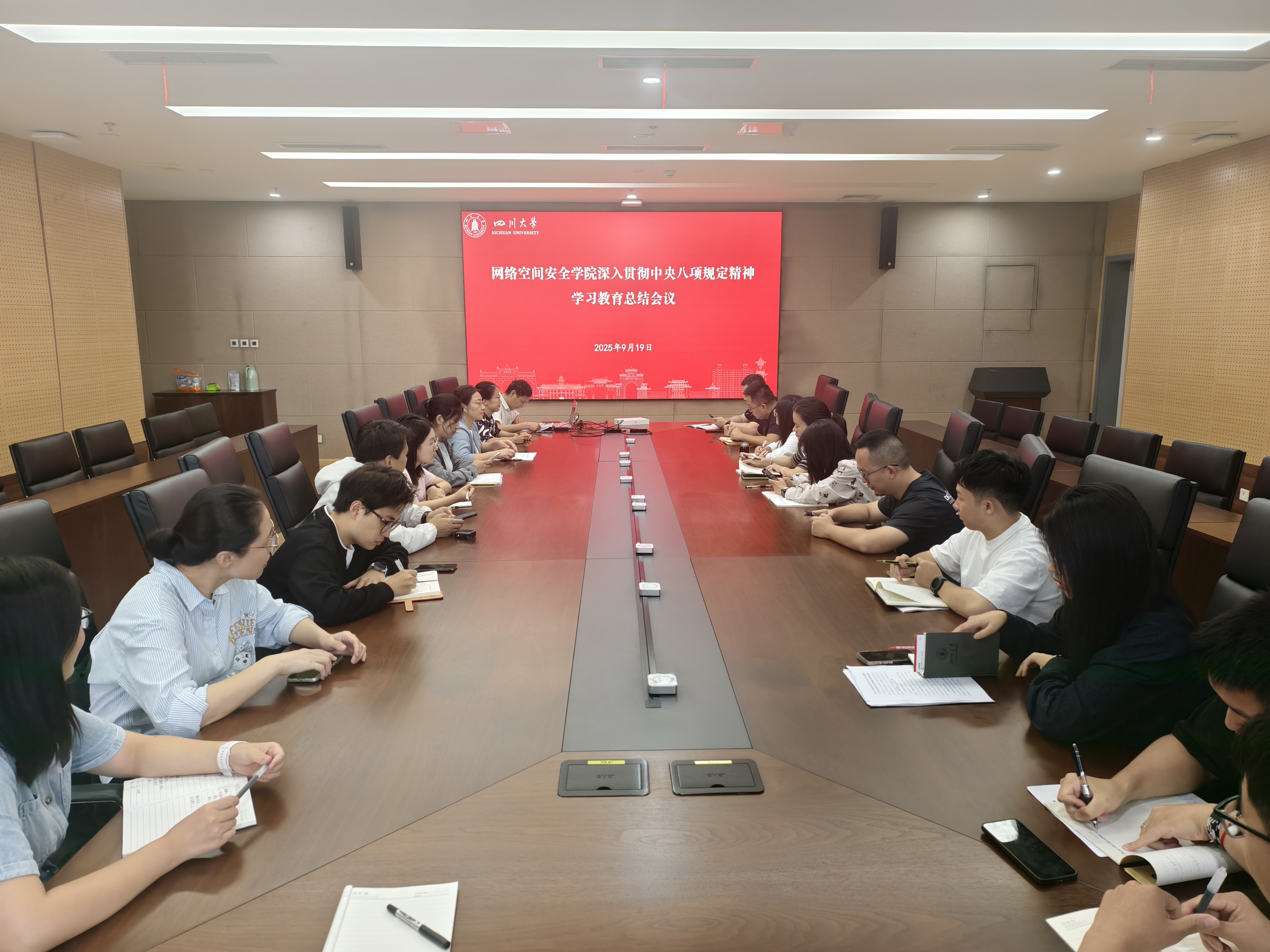 9月19日,网络空间安全学院在江安校区多学科交叉研究创新大楼821会议室召开深入贯彻中央八项规定精神学习教育总结会议。学院领导班子成员、党总支委员、专职组织员、党政办主任、各党支部书记及支委参加会议。学院专职组织员彭绍东主持会议。