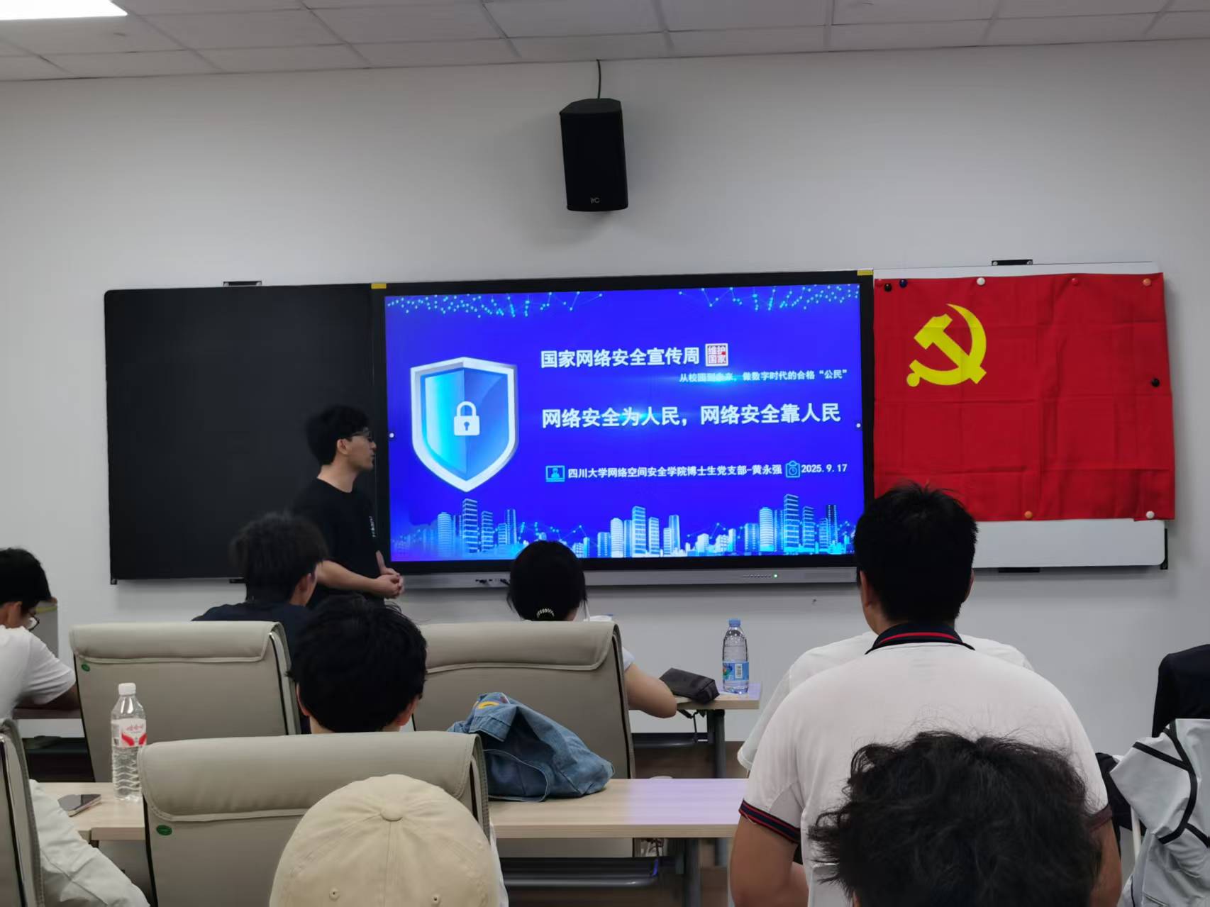 本次活动围绕国家网络安全宣传周背景、网络安全法律法规及个人防护措施等内容展开。网络空间安全学院博士生党支部黄永强博士结合实际案例,生动讲解了网络安全的重要性,普及了防诈骗、防信息泄露等实用知识。