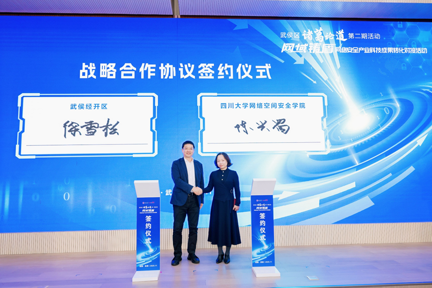 活动现场,四川大学网络空间安全学院与成都市武侯经济开发区管委会签署了战略合作协议,将学院的人才、科技成果等创新资源与武侯区的发展需求精准对接,在创新人才培养、关键技术攻关、科技成果转化等方面开展深度合作。