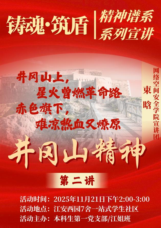 为深入学习贯彻习近平新时代中国特色社会主义思想,认真落实习近平总书记关于“传承红色基因,赓续红色血脉”的重要指示精神,弘扬中国共产党人精神谱系为青年践行使命担当筑牢精神高地,2025年11月21日,四川大学百川青年学生宣讲团网络空间安全学院分团在江安校区西园7舍“一站式”学生社区,面向本院2024级入党积极分子及生物医学工程学院江姐争创班学生,成功开展了“铸魂·筑盾精神谱系系列”之“井冈山精神”主题宣讲活动。