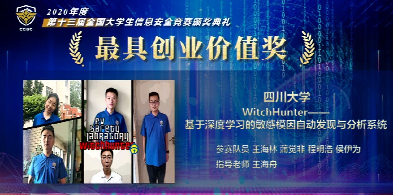 8月19日,第十三届全国大学生信息安全竞赛(作品赛)获奖名单正式揭晓。我院学子在本次竞赛中再创佳绩,斩获全国一等奖2项、二等奖3项、三等奖1项。其中一等奖项目“WitchHunter-基于深度学习的敏感模因自动发现与分析系统”还获得了本次大赛特别设立的“最具创新创业价值奖”。四川大学荣获优秀组织奖(共八所高校,位列第一),王海舟、黄诚两位老师荣获优秀指导教师奖。