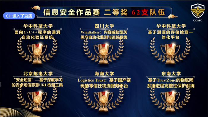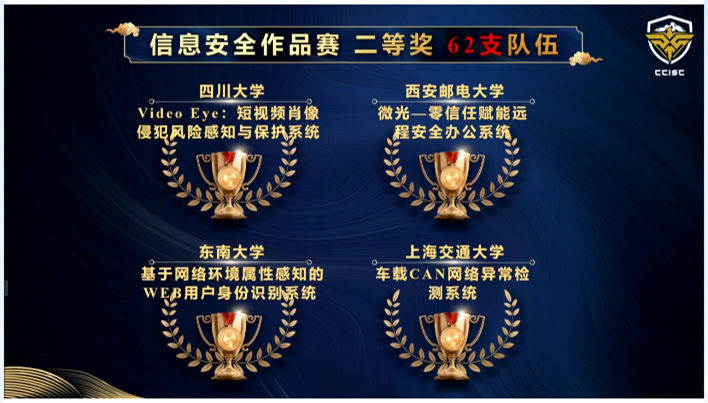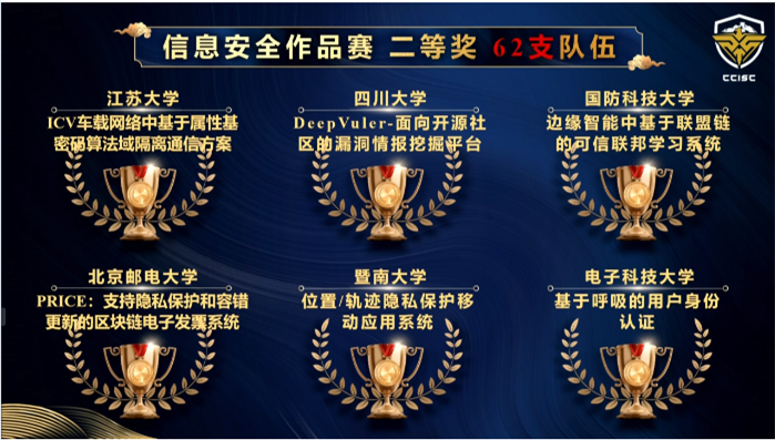 全国大学生信息安全竞赛由教育部高等学校网络空间安全专业教学指导委员会主办,是我国网络空间安全学科领域的奥林匹克竞赛。据悉,全国大学生信息安全竞赛已正式入选全国普通高校学科竞赛排行榜,为目前网络空间安全学科领域唯一一个入选排行榜的赛事。本届作品赛由山东大学承办,总决赛采取线上随机分区评审的形式,共有来自全国156所高校的718支团队、2603名大学生参加,最终评选出最具创新创业价值奖2项、一等奖40项、二等奖62项、三等奖81项、优胜奖113项。