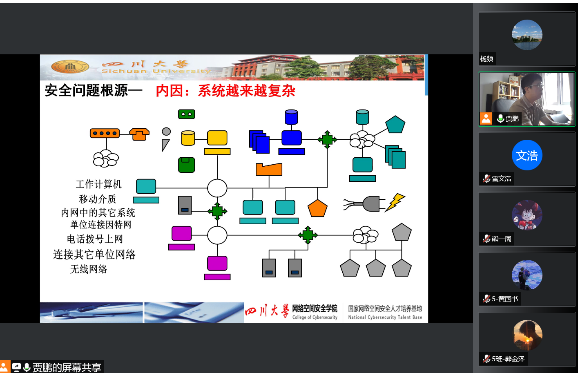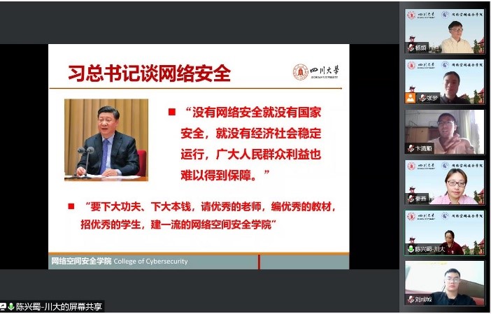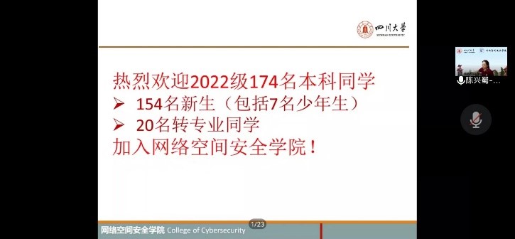 因成都受疫情影响,目前仍在静默管控期,新生开学延迟,但仍有52位新生同学已经报到。9月6日上午10点,网安学院首次召开了线上本科新生开学典礼,由学院党总支书记秦燕主持,所有院领导、2022级辅导员及教学科老师参会。2022年9月5日至11日,正值国家网络安全宣传周,学院院长陈兴蜀代表学院热烈欢迎2022级本科新生,向新同学介绍学院情况和网络空间安全学科,并借此契机为同学们上了别开生面的大学第一课。