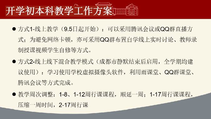 自9月5日起开始,本科教学开启线上教学,可以采用腾讯会议或QQ群直播方式;为避免网络卡顿,亦可采用QQ群布置自学线上实时讨论、教师录制授课视频学生自修等方式。建立课程QQ(微信)群,并通知到每一位学生。做好备课工作,提前确认用于上课的网络环境能否满足要求,电脑摄像头、音频、耳机等设备能否正常工作;课程网站建立与维护,公示课程大纲,考核方式,教学要求等;提供基本的课程学习资料——课件、线上讨论题目、作业等;建议上课老师使用至少两个设备:电脑开启腾讯会议用于直播;手机或者另外一台电脑用于课堂讨论(开启QQ或者微信,观察学生在QQ群的发言)。加强课堂互动,课堂抽问,讨论、练习等形式,确认学生在听课;助教线上协助教师签到、观察课堂表现、课堂提问等;布置作业,可线下或者线上做,扫描方式提交;课后答疑,每次课程结束最好能做一个线上调查,及时反馈。