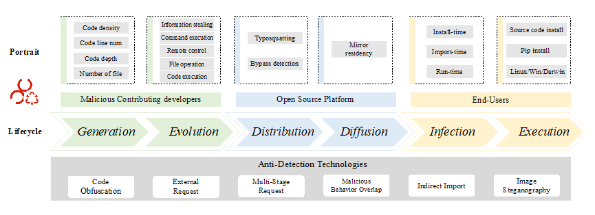 最后,本研究给出了PyPI生态系统中恶意代码的生命周期图,有效反映了恶意代码在不同阶段的特征。并提出了一些建议的缓解措施,以提高Python开源生态系统的安全性。
