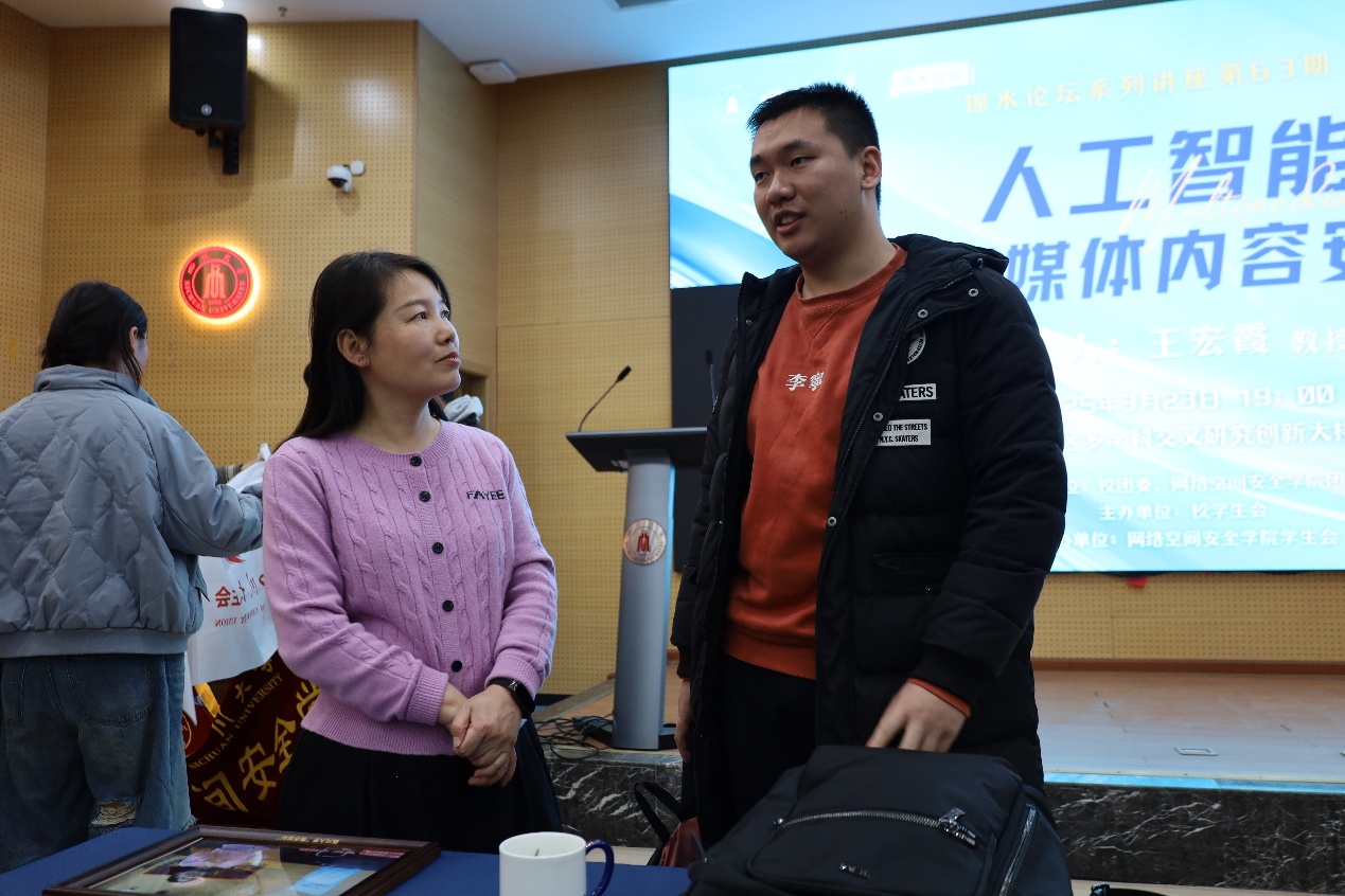 互动环节将讲座推向高潮。同学们纷纷举手,抛出心中疑惑。从技术原理到实际应用,从行业发展到未来挑战,问题一个接一个。王宏霞教授耐心解答,专业的讲解、生动的比喻,让复杂的知识变得通俗易懂,现场掌声不断。