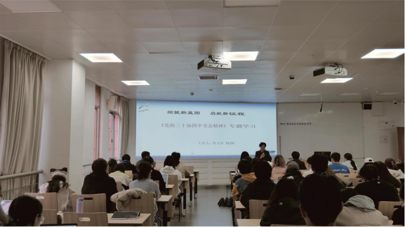 陈文泽教授以“绘就新蓝图,启航新征程”为题,围绕党的二十届四中全会精神作专题讲座。她带领同学们回顾了历届党的中央委员会全体会议的主要议程,指出科学制定并接续实施五年规划,是党治国理政一条重要经验,也是中国特色社会主义制度的显著政治优势。随后,陈文泽教授重点阐释了党的二十届四中全会最重要的成果是审议通过了《中共中央关于制定国民经济和社会发展第十五个五年规划的建议》(以下简称《建议》)。她结合《建议》的起草过程,深入解读了其中体现的科学决策、民主决策和依法决策原则,展现了党内民主和全过程人民民主的生动实践。