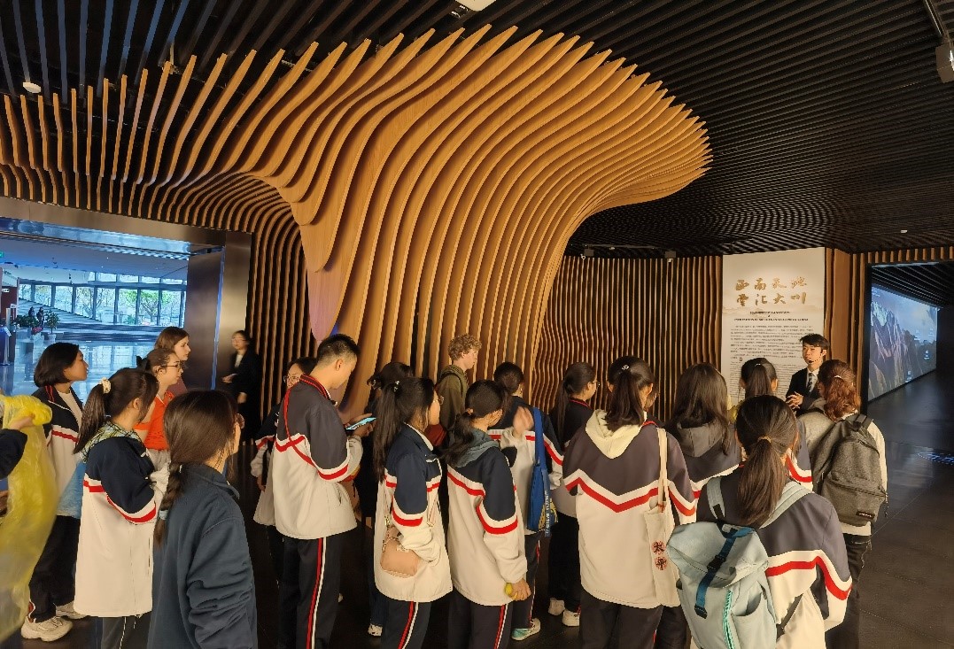 网络空间安全学院本科教学科何露老师陪同中法师生从学校北门步行到东门,沿途参观了大红门、双荷池、基础教学楼、校史馆、江姐纪念馆等景观,最终来到全新建成的四川大学博物馆进行研学参观。四川大学博物馆是中国西南地区建立最早、也是中国第一座综合性大学博物馆,是中国历史最为悠久的博物馆之一,它将人文与自然结合,艺术与科学结合,科学研究与大众普及相结合,形成独具特色的藏品组成结构。中法师生们通过馆内的专员讲解,近距离感受馆内的陈列展示,与藏品们展开一场跨越百年时空的文化交流,对这片中国的西南大地有了更切实的感触。
